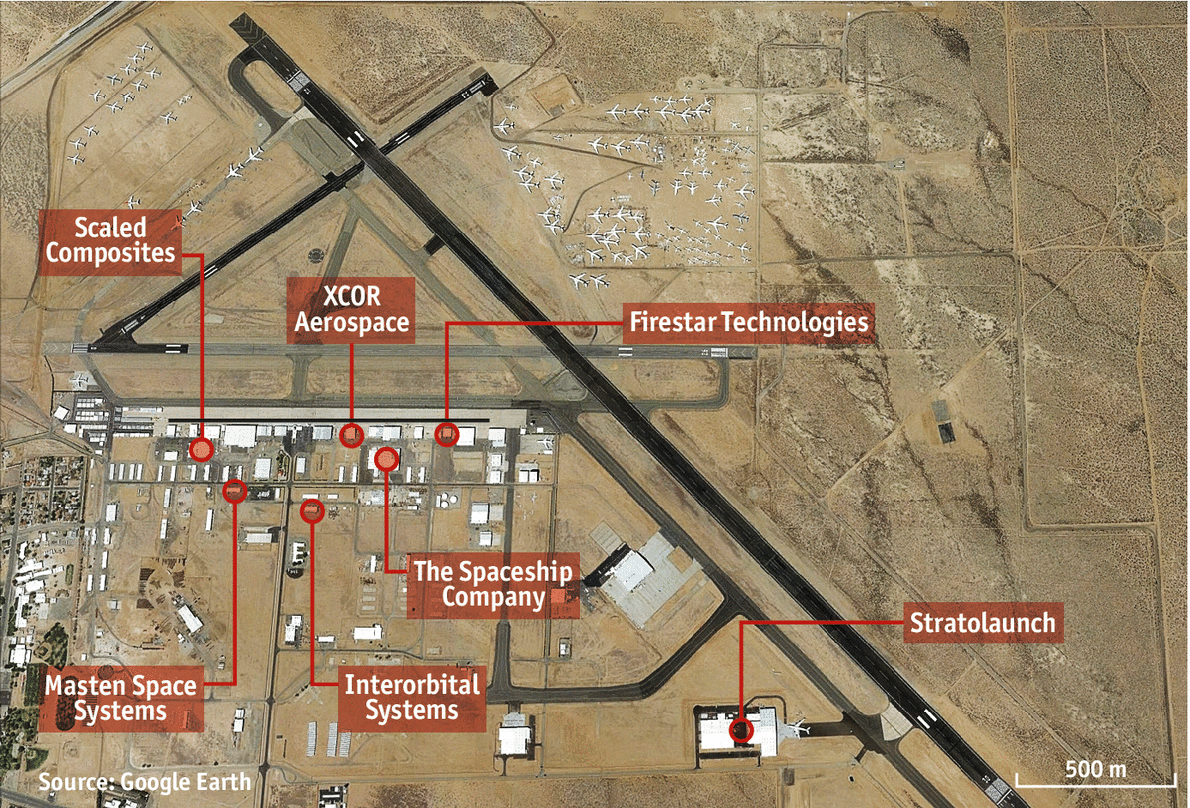 IT BEGAN with a boom. In 1947, Chuck Yeager became the first man to break the sound barrier. He flew from Edwards Air Force Base in the Mojave Desert, America’s main center for experimental military flights. This base was out-of-the-way of prying eyes and surrounded by landscape into which a crash (and there were many) would not inconvenience anyone. Now, reports The Economist (Dec.21,2013-Jan. 4, 2014), the Mojave Desert is emerging as the site of a cluster of what has come to be known as New Space.